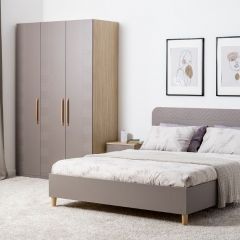 Подвесные консоли и велюровый пуф в тон фасадов дополняют сдержанный и благородный облик спальни Амьен.
